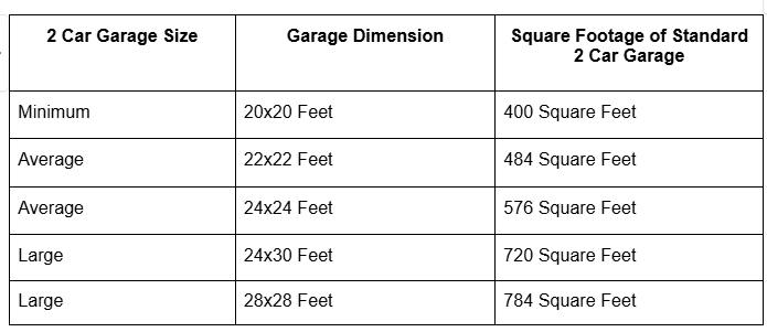 If you are okay with a tight squeeze and want to stay budget friendly then the minimum 2 car garage dimensions are 20x20 feet, which is equal to 400 square feet. You can also go for a 24x24 foot garage, making it to 484 square feet, but remember, this comes with some extra price.